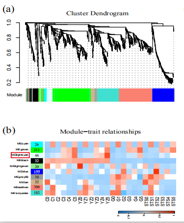 然后作者利用高分文章利器:WGCNA分析,進(jìn)行數(shù)據(jù)深度挖掘和整理,推薦大家使用百邁客云平臺(tái)小工具WGCNA模塊,可以出來(lái)和作者同樣高大上的圖片。