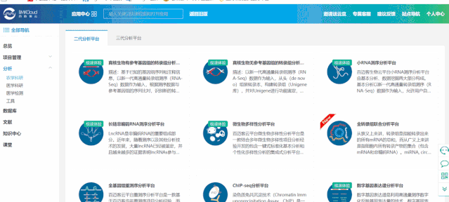 百邁客云包含農(nóng)學(xué)和醫(yī)學(xué)兩大類(lèi)分析平臺(tái),醫(yī)學(xué)分析平臺(tái)主要針對(duì)人、鼠數(shù)據(jù)的分析,包含:轉(zhuǎn)錄組、非編碼RNA、單基因病外顯子、腫瘤外顯子、重測(cè)序等數(shù)據(jù)分析,以及全轉(zhuǎn)錄組聯(lián)合分析;農(nóng)學(xué)分析平臺(tái)可以應(yīng)用到更多的物種,涵蓋轉(zhuǎn)錄組、非編碼RNA、微生物、蛋白、代謝等數(shù)據(jù)的分析,以及全轉(zhuǎn)錄組聯(lián)合分析等。點(diǎn)擊左側(cè)導(dǎo)航分析->農(nóng)學(xué)或者醫(yī)學(xué)打開(kāi)分析平臺(tái)列表頁(yè)面,點(diǎn)擊選擇您想要使用的分析平臺(tái),打開(kāi)其詳細(xì)介紹頁(yè)面,該頁(yè)面可以看到該平臺(tái)的應(yīng)用領(lǐng)域“平臺(tái)介紹“技術(shù)背景“案例“課堂“版本記錄,點(diǎn)擊打開(kāi)軟件即可進(jìn)入到參數(shù)頁(yè)面。